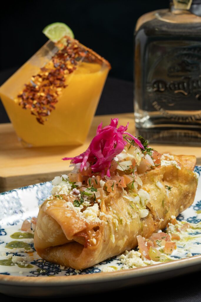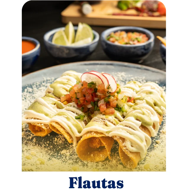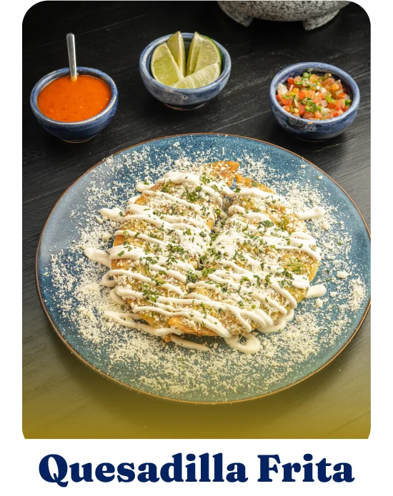 Tortilla de maíz rellenas de quesos y pierna de cerdo desmechada a la fritura, acompañada de salsas de la casa y pico de gallo.