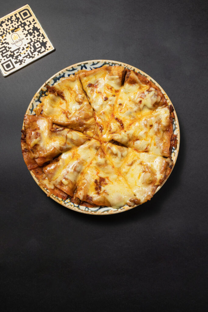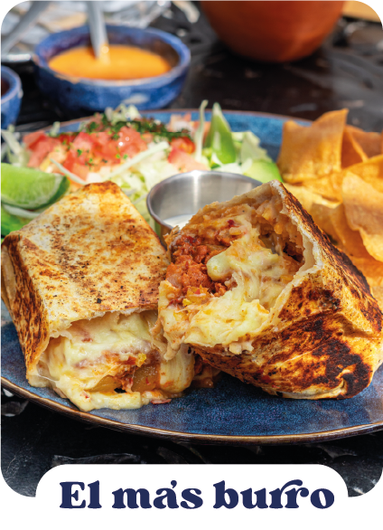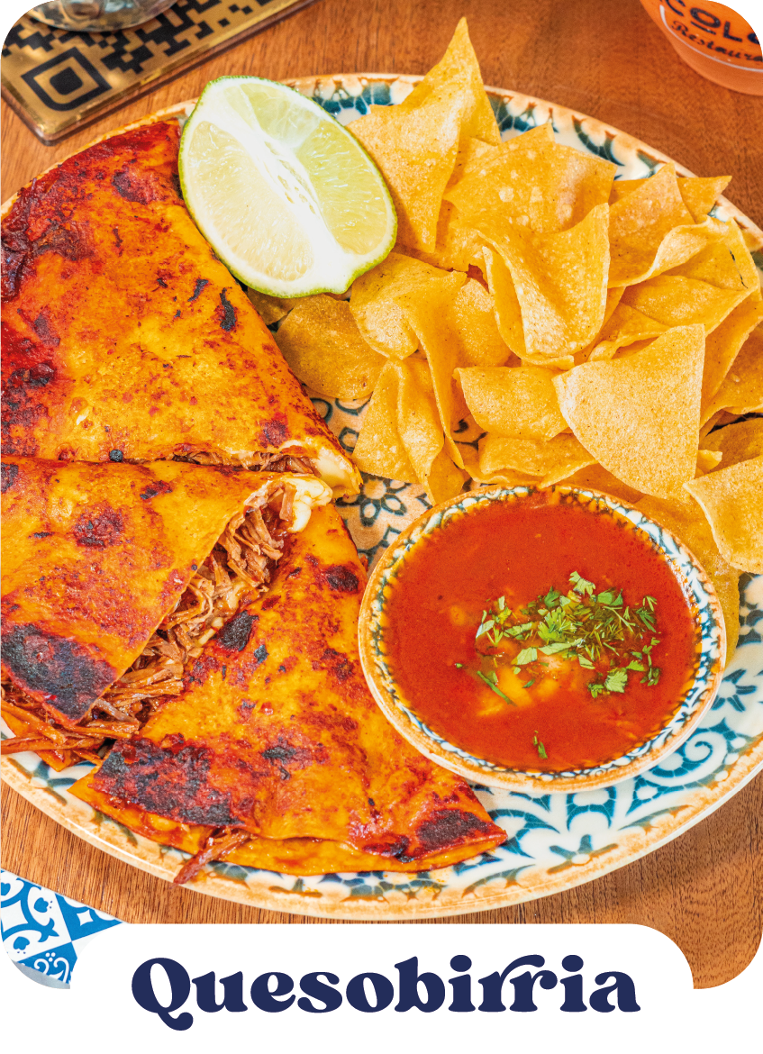 Tortillas de harina de trigo de 25cc, 180gr de birria, una mezcla de quesos de la casa, porcionada en 8 porciones, decorada con toques de cilantro, junto con un caldo de birria.