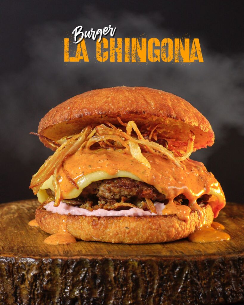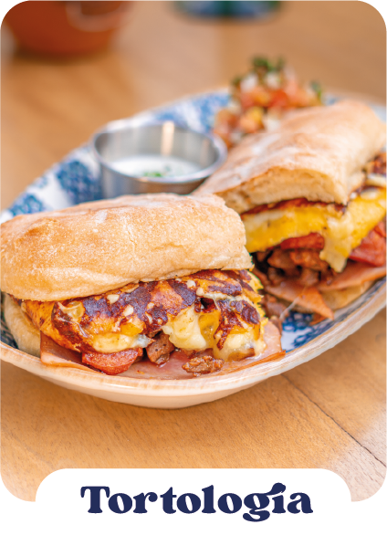 Pan ciabatta, mezcla de quesos de la casa, una aioli chipotle de la casa, pierna de cerdo ahumada y piña rostisada, acompañada con totopos.